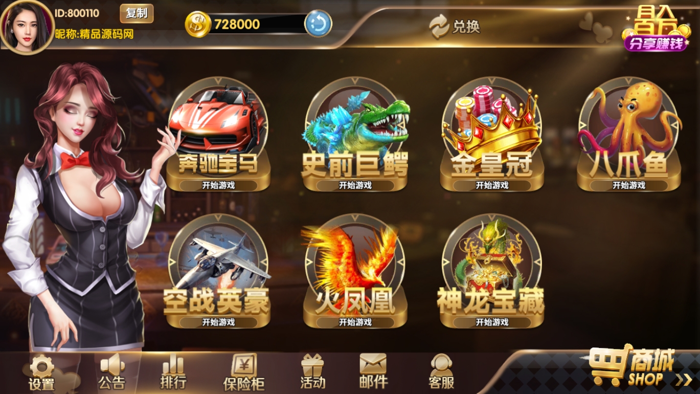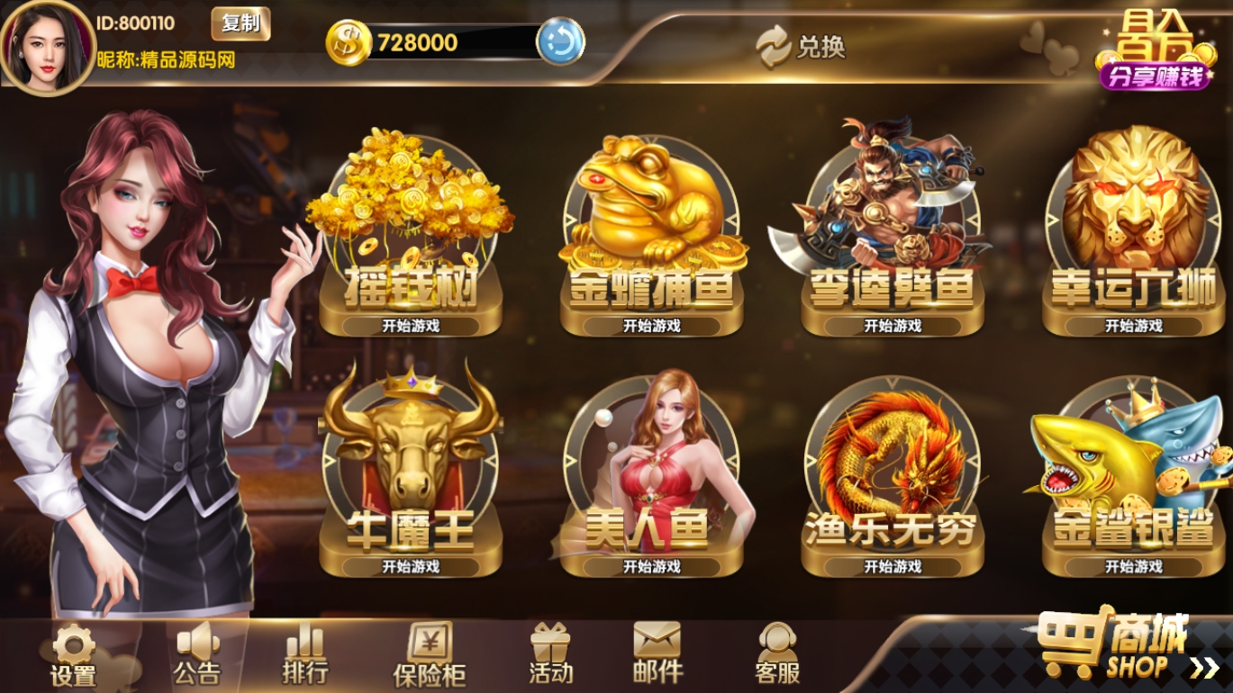 平台一共16款子游戏:摇钱树,金蟾捕鱼,李逵劈鱼,单挑,牛魔王,美人鱼,渔乐无穷,幸运六狮,单挑(ATT连环炮)金鲨银鲨,空战英豪,火凤凰,神龙宝藏,奔驰宝马,史前巨鳄,金皇冠,八爪鱼。